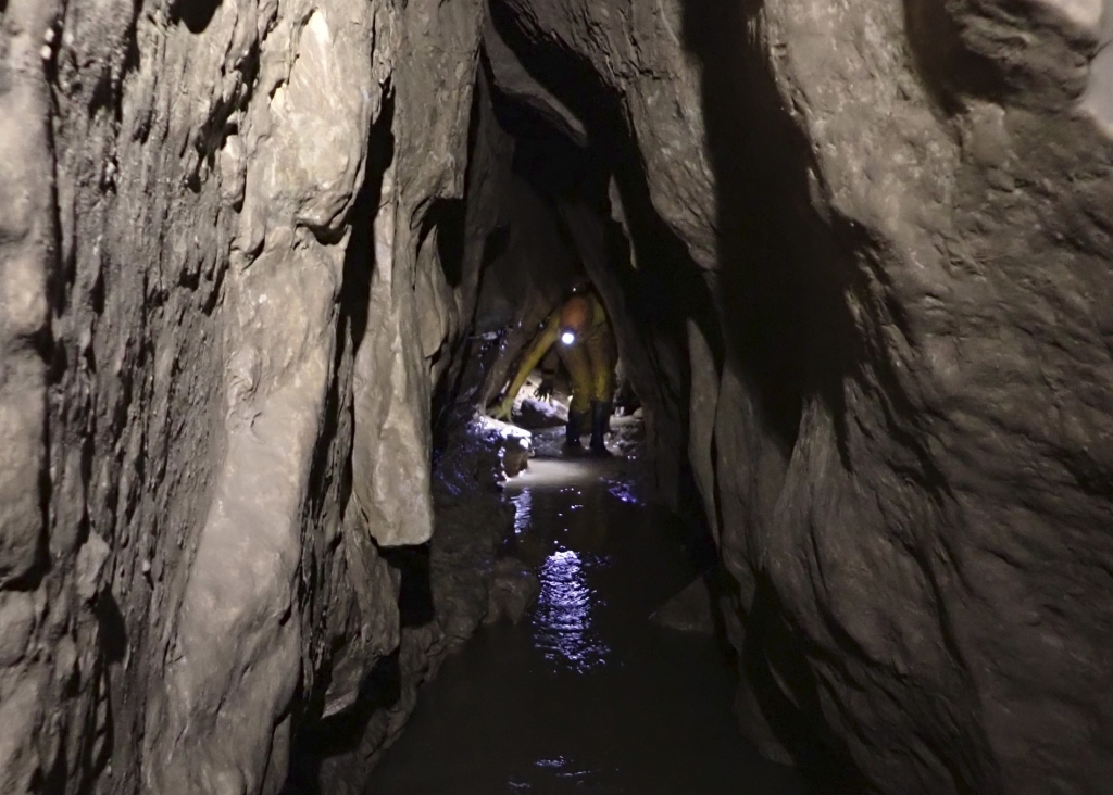 C'est entre deux grêlons que nous nous changeons au pied du puits, puis nous voilà prêts pour la visite. Balade souterraine agréable dans une cavité où l'eau n'est pas trop haute, mais où des traces de crues montrent que les pluies de février sont passées par là. Une fine couche de glaise recouvre les blocs : la décrue a dû être lente. A 350 m de l'entrée, des traces de crues sont visibles à 2 m au-dessus du sol. L'eau est donc montée d'au moins 10 m dans le puits d'entrée !